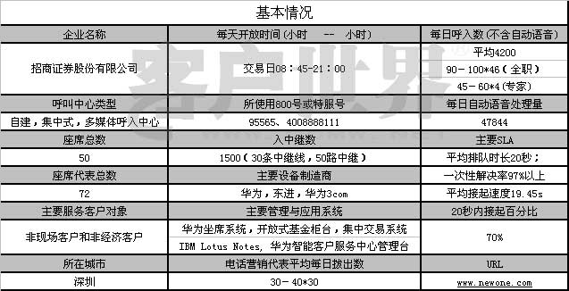 伴隨著招商證券業(yè)務(wù)種類的豐富、經(jīng)紀(jì)業(yè)務(wù)的迅猛發(fā)展,目前中心配備50名高素質(zhì)座席代表、日均受理電話量4200通、接通率保持在96%以上的規(guī)模與水平,并以全面的專業(yè)技能、優(yōu)質(zhì)標(biāo)準(zhǔn)化的服務(wù)在證券行業(yè)中已處于領(lǐng)先水平,引導(dǎo)了證券業(yè)內(nèi)經(jīng)紀(jì)業(yè)務(wù)電話服務(wù)的標(biāo)準(zhǔn),在業(yè)內(nèi)及客戶群中樹立了良好的口碑,成為客戶和行業(yè)公認(rèn)的楷模與標(biāo)桿,促進(jìn)了證券行業(yè)服務(wù)品質(zhì)的提升,引領(lǐng)了證券行業(yè)非現(xiàn)場(chǎng)服務(wù)的新潮流;改善了公司營業(yè)部現(xiàn)場(chǎng)服務(wù),無法完全滿足客戶日益增長的需求狀況,給客戶帶來了不錯(cuò)的客戶體驗(yàn),為公司服務(wù)升級(jí)和業(yè)務(wù)發(fā)展提供了有力保障和支撐。