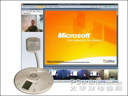 微軟Office RoundTable,音頻-視頻協(xié)作設(shè)備,帶有一個(gè)獨(dú)特的 360 度相機(jī)。在結(jié)合 Office Communications Server 2007 使用時(shí),RoundTable 還可交付卓越的會(huì)議體驗(yàn):將會(huì)議環(huán)境擴(kuò)展到多個(gè)位置。現(xiàn)場(chǎng)及遠(yuǎn)程位置的與會(huì)人員可以全景查看會(huì)議室中的每位成員,還可以在輪流發(fā)言時(shí)拉近特寫某個(gè)與會(huì)者。