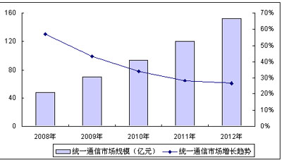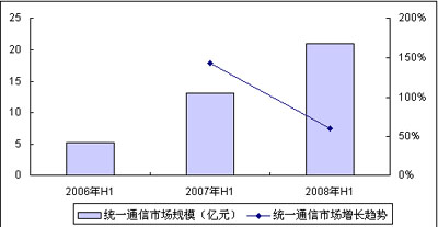 統(tǒng)一通信作為一種以融合技術(shù)為基本特征的特定解決方案和應(yīng)用,通過對(duì)各種溝通方式進(jìn)行有效的融合,滿足用戶方便快捷的信息獲取和溝通需求,近年來在全球范圍內(nèi)得到了迅猛發(fā)展,各大通信與信息技術(shù)相關(guān)廠商紛紛加入統(tǒng)一通信市場的競爭中。賽迪顧問數(shù)據(jù)統(tǒng)計(jì)顯示,2008年上半年,中國統(tǒng)一通信整體市場規(guī)模已達(dá)到21.01億元,同比增長超過60.9%,繼續(xù)保持強(qiáng)勁的增長勢(shì)頭。