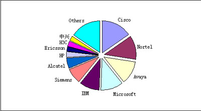 各大通信與IT廠商都在厲兵秣馬,充分挖掘企業(yè)的自身優(yōu)勢(shì),準(zhǔn)備在潛力巨大的統(tǒng)一通信市場中取得良好戰(zhàn)績。賽迪顧問數(shù)據(jù)顯示,2008年上半年,中國統(tǒng)一通信市場中,Cisco公司以15.3%的市場份額繼續(xù)保持領(lǐng)頭樣的位置,在通信設(shè)備領(lǐng)域,Nortel和Avaya分別以12.1%和11.7%的市場份額緊隨其后。值得一提的是Microsoft和IBM以其在全球獨(dú)一無二的終端用戶,迅速占領(lǐng)統(tǒng)一通信軟件市場,無論是市場份額還是整體競爭力都成績不俗,且增長勢(shì)頭強(qiáng)勁。各大廠商短時(shí)間的涌入,使得統(tǒng)一通信市場出現(xiàn)了前所未有的群雄逐鹿的局面,競爭異常激烈。