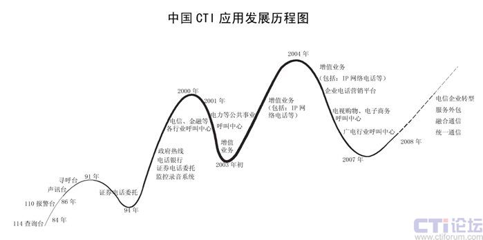CTI在中國已經發(fā)展了二十多年,已經從最早的電信行業(yè)CTI應用發(fā)展到金融(包括銀行、保險、證劵及基金)、電力、郵政、企業(yè)(包括煙草、汽車、家電、IT、互聯(lián)網、旅游、報業(yè)、航空、物流、醫(yī)療、公共事業(yè)等)、政府、軍隊等各行各業(yè)的應用。特別在1995年到2001時期,是CTI應用發(fā)展最快,普及面最廣的時期,也是CTI市場進入了第二次高潮;從2002開始增值業(yè)務是整個CTI行業(yè)的突破口,整個行業(yè)以增值業(yè)務為主,CTI市場進入了第三次高潮;從2006年開始,增值業(yè)務進入了衰退期,整個CTI行業(yè)市場出現了嚴重的危機,加上新的技術出現,技術的換代,對原來的傳統(tǒng)語音產品和公司是個致命的打擊。