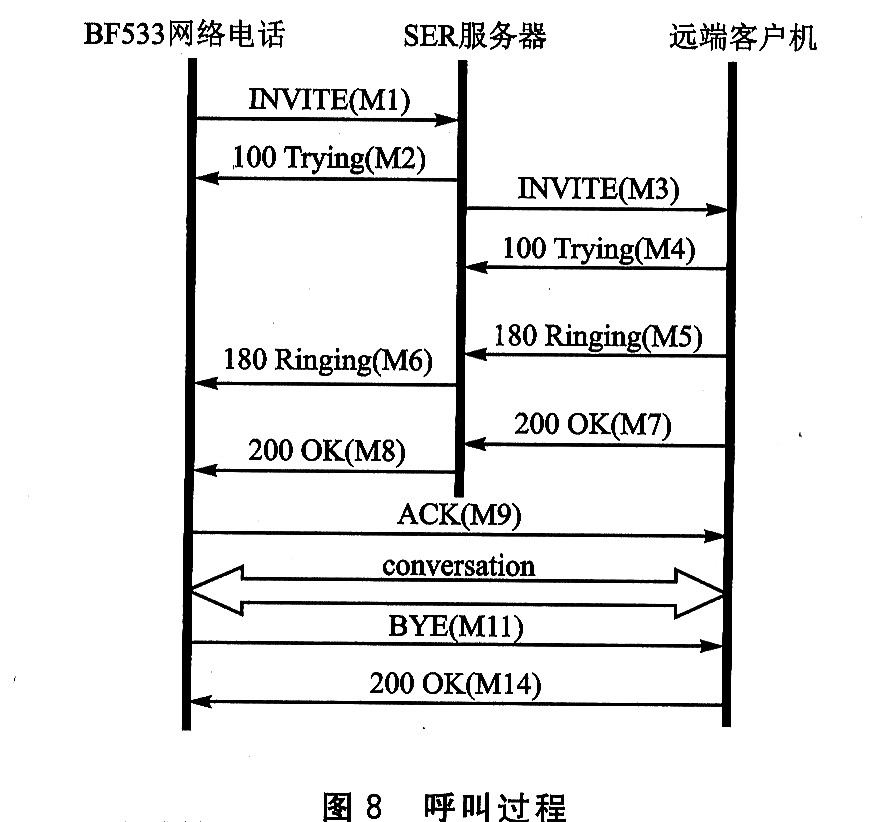 呼叫過程如圖8所示。BF533網絡電話(BP)先是向SER服務器發(fā)送了一條INⅥTE消息(M1),要求與遠端客戶機(RC)進行對話。SER馬上回復一條100