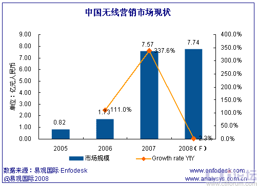 易觀國際(Analysys International)研究發(fā)現(xiàn),中國無線營銷市場(chǎng)經(jīng)過2007年的高速發(fā)展后,2008年已經(jīng)進(jìn)入了商業(yè)模式探索階段,從市場(chǎng)規(guī)模上看,2008年全年無線營銷市場(chǎng)規(guī)模僅比上年增長(zhǎng)2.3%。易觀國際(Analysys International)認(rèn)為,無線營銷市場(chǎng)增速的明顯放緩主要由于短信廣告市場(chǎng)的萎縮,短信廣告是無線營銷市場(chǎng)最大的細(xì)分領(lǐng)域,2007年曾經(jīng)占整個(gè)無線營銷市場(chǎng)規(guī)模的72.7%。