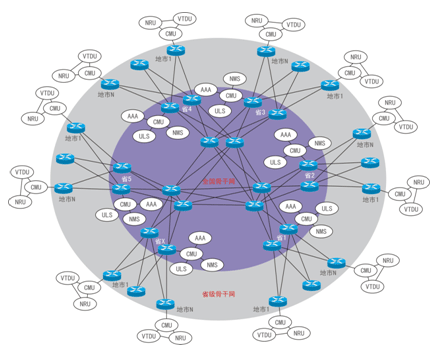 全國(guó)骨干網(wǎng)用于承載跨省監(jiān)控業(yè)務(wù)的媒體及信令傳送,省級(jí)骨干網(wǎng)用于承載跨地市監(jiān)控業(yè)務(wù)的媒體及信令傳送。全國(guó)骨干網(wǎng)與省級(jí)骨干網(wǎng)的網(wǎng)絡(luò)承載模型如下圖所示: