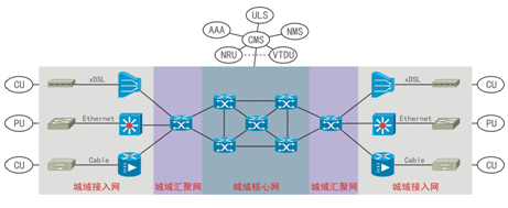 城域網(wǎng)包括核心層、匯聚層以及接入層,主要用于承載本域PU、CU與本域中心服務(wù)平臺(tái)之間的媒體及信令傳送。城域網(wǎng)的網(wǎng)絡(luò)承載模型如下圖所示: