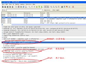 以上是一個(gè)用戶開(kāi)機(jī)的信令過(guò)程,在BSSMAP消息層中,可以獲取CGI=0X0457-2222;在DTAP消息層中,可以獲得獲得本次消息類(lèi)型為L(zhǎng)ocationUpdatingREQ,同時(shí)用戶標(biāo)識(shí)為T(mén)MSI=0X8c000093,通過(guò)對(duì)對(duì)之前或之后(簽權(quán)、IDREQ/RSP)等信令的關(guān)聯(lián),可以獲得用戶IMSI、MSISDN和CGI的對(duì)應(yīng)關(guān)系。其它信令過(guò)程,如周期性位置更新、短信收發(fā)、主被叫等,和以上分析過(guò)程類(lèi)似。