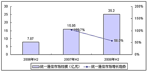 賽迪顧問數(shù)據(jù)顯示,2008年下半年,中國統(tǒng)一通信市場繼續(xù)延續(xù)了上半年的快速增長,整體市場規(guī)模超過了25.2億,同比增長58%,超過2007年全年市場規(guī)模。