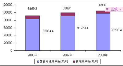圖2 2006-2008年電話(huà)用戶(hù)數(shù)及新增用戶(hù)數(shù)