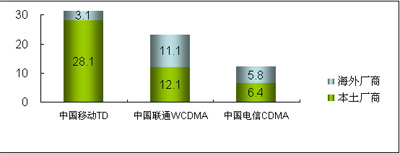 在3G設(shè)備市場(chǎng)方面,2008年,中國(guó)的WCDMA、CDMA2000與TD-SCDMA三種3G網(wǎng)絡(luò)在建設(shè)上有不同的進(jìn)展。中國(guó)移動(dòng)啟動(dòng)了第二階段的TD-SCDMA網(wǎng)絡(luò)建設(shè)、中國(guó)電信啟動(dòng)了涉及面向81個(gè)重點(diǎn)城市的CDMA全網(wǎng)招標(biāo)、而中國(guó)聯(lián)通也開(kāi)始7個(gè)城市建立WCDMA試驗(yàn)網(wǎng)絡(luò)的建設(shè)工作。而在所有的網(wǎng)絡(luò)建設(shè)中,中國(guó)本土廠(chǎng)商借3G契機(jī)迅速提升競(jìng)爭(zhēng)力,占據(jù)了3G網(wǎng)絡(luò)建設(shè)大部分市場(chǎng)份額。