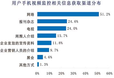 另一方面,運(yùn)營商的宣傳不到位。從諾達(dá)咨詢調(diào)查數(shù)據(jù)來看,用戶目前獲得手機(jī)視頻監(jiān)控相關(guān)信息的主要渠道是互聯(lián)網(wǎng),有51%的用戶是通過互聯(lián)網(wǎng)了解手機(jī)視頻監(jiān)控的,而從傳統(tǒng)的電視媒體和報(bào)刊雜志獲得相關(guān)信息的用戶僅僅約各占24%,通過相關(guān)手機(jī)視頻監(jiān)控企業(yè)發(fā)放宣傳資料和介紹獲取相關(guān)信息的用戶各占12%和10%。由此可見,手機(jī)視頻監(jiān)控的宣傳尚不到位,導(dǎo)致消費(fèi)者不能通過多方渠道獲取相關(guān)信息。
