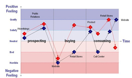 看一看“情感曲線(xiàn)”也許你就會(huì)頓悟。此處所示的兩條曲線(xiàn)來(lái)自?xún)蓚(gè)國(guó)際銀行。請(qǐng)注意曲線(xiàn)的不同之處。紅線(xiàn)所示的銀行與藍(lán)線(xiàn)所示的銀行相比在呼叫中心服務(wù)和店內(nèi)體驗(yàn)上都要略勝一籌。而藍(lán)線(xiàn)所示銀行在網(wǎng)上銀行這一項(xiàng)上表現(xiàn)更好。“紅線(xiàn)”銀行的競(jìng)爭(zhēng)資本是其卓越的客戶(hù)互動(dòng)體驗(yàn),無(wú)論是分行的面對(duì)面互動(dòng)還是來(lái)自聯(lián)絡(luò)中心的遠(yuǎn)程體驗(yàn)都屬一流。