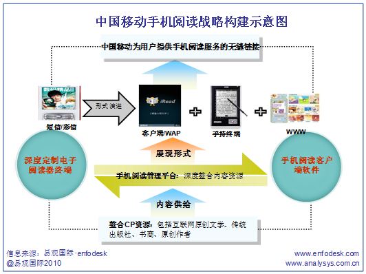 易觀國際(Analysys International)分析認(rèn)為,中國移動發(fā)展手機(jī)閱讀的整體思路是基于渠道資源,縱貫內(nèi)容、終端以強(qiáng)勢整合手機(jī)閱讀的產(chǎn)業(yè)鏈。將原有的手機(jī)閱讀的短信/彩信形式演變?yōu)榭蛻舳塑浖?WAP、手持終端、WWW的形式,最終為用戶提供手機(jī)閱讀的無縫鏈接體驗(yàn)。