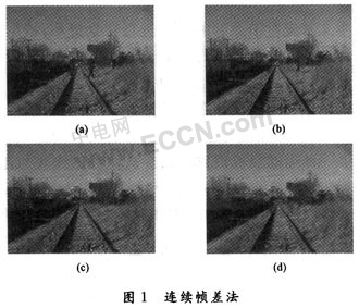 綜合考慮以上四種背景提取方法,本文采用結(jié)合多幀圖像平均法和連續(xù)幀差法這兩種方法來進行視頻序列背景的提取?紤]到運動目標的多樣性,有目標經(jīng)過視場而引起的變化長時間內(nèi)可忽略不計。多幀圖像平均法時將運動目標看作為噪聲,用累加平均的方法消除噪聲,利用目標運行一段時間的序列圖像進行平均而得到視場背景圖像。連續(xù)幀差算法是通過當前幀的圖像與前一幀圖像的差值找到運動區(qū)域,對運動區(qū)域的背景保持不變,而非運動區(qū)域的背景則用當前幀進行更新,經(jīng)過一段時間的迭代便可提取出背景。兩種方法的結(jié)合可以很好地彌補各自的缺點,能夠適應(yīng)鐵路沿線周邊環(huán)境的要求,對存在運動目標的背景能夠提取出質(zhì)量較高的背景圖像。具體過程如下: