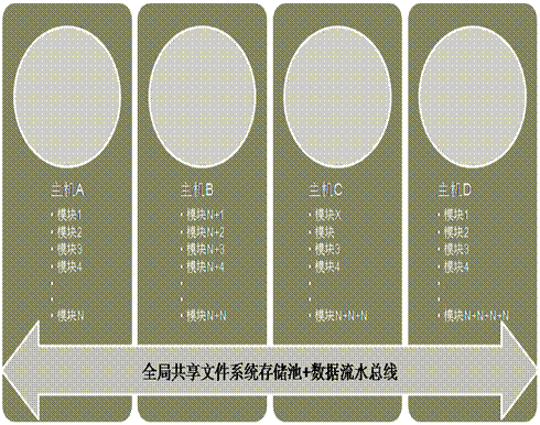 該技術方案是依靠在存儲管理虛擬層上構建并行文件系統(tǒng),實現(xiàn)所有業(yè)務主機共享同一份數據視圖,實現(xiàn)并發(fā)數據共享訪問的架構設計方案。其架構示意圖如下: