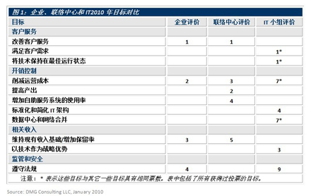 DMG的基準(zhǔn)調(diào)研顯示IT有自己的優(yōu)先級(jí):IT2010年的首要目標(biāo)是滿足商業(yè)客戶的需求并使企業(yè)的技術(shù)和應(yīng)用軟件運(yùn)行在最佳狀態(tài)。這表明IT企業(yè)是帶著強(qiáng)烈的支持企業(yè)客戶目標(biāo)和目的的意愿步入2010年的。但令人失望的是IT企業(yè)并沒有努力去了解他們客戶的目標(biāo)。這種目標(biāo)上的不一致是導(dǎo)致IT和聯(lián)絡(luò)中心之間缺乏信任的主要原因。