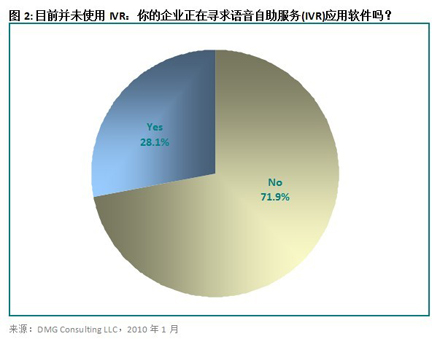 28.1%目前還沒有使用IVR系統(tǒng)的公司正在積極尋求語(yǔ)音自助服務(wù)解決方案來(lái)幫助自己達(dá)成目標(biāo),這一數(shù)字高得頗讓人驚訝。見圖2。經(jīng)濟(jì)衰退促使那些曾經(jīng)對(duì)使用自助服務(wù)技術(shù)猶豫不決的企業(yè)下定決心投資購(gòu)買此類解決方案。一個(gè)具有正確規(guī)劃、設(shè)計(jì)和投放過程的IVR系統(tǒng)能夠?qū)⑷斯ご硖幚淼碾娫捔拷档?0%到90% (長(zhǎng)期來(lái)說),具體數(shù)字有賴于聯(lián)絡(luò)中心的目的以及編入解決方案內(nèi)部的任務(wù)。IVR用戶的增長(zhǎng)勢(shì)頭有望在經(jīng)濟(jì)形勢(shì)好轉(zhuǎn)之后仍然延續(xù)下去。一個(gè)經(jīng)過良好設(shè)計(jì)并成功實(shí)施的IVR方案所帶來(lái)的利益和節(jié)約的成本是即便最不情愿使用它的經(jīng)理都不得不承認(rèn)的。