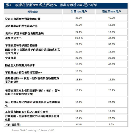 圖3顯示了現(xiàn)有和潛在的語(yǔ)音自助服務(wù)用戶尋求托管型IVR的主要?jiǎng)恿?lái)源。潛在客戶認(rèn)真考慮托管型IVR解決方案的兩個(gè)很明顯的原因是避免大的資金開銷和最小化啟動(dòng)成本,在經(jīng)濟(jì)不景氣時(shí)這樣的做法并不令人意外。另外還有個(gè)原因是希望一邊使用該方案一邊積累經(jīng)驗(yàn)和知識(shí)。