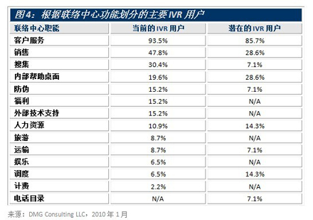 圖4根據(jù)職能對(duì)現(xiàn)有和潛在的主要IVR用戶進(jìn)行了區(qū)分?蛻舴⻊(wù)和銷售聯(lián)絡(luò)中心是最上層的IVR用戶,分別占現(xiàn)有用戶量的93.5%和47.8%,占潛在用戶量的85.7%和28.6%。