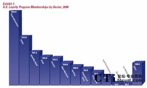 在美國(guó),忠誠(chéng)度營(yíng)銷應(yīng)該用為廣泛的五個(gè)行業(yè)/領(lǐng)域是金融服務(wù)(銀行、保險(xiǎn)、證券、基金等)、航空、專門(mén)零售(例如各類的專賣(mài)店、品牌連鎖)、酒店及百貨。值得一提的是,近兩年來(lái),金融服務(wù)行業(yè)在忠誠(chéng)度營(yíng)銷的應(yīng)用發(fā)展迅速,各類忠誠(chéng)度計(jì)劃的參與人數(shù)由2006年的2.388億上升到2008年的4.22億,這個(gè)增長(zhǎng)主要是由各類具備信用卡、借記卡功能的聯(lián)名卡發(fā)行所致。