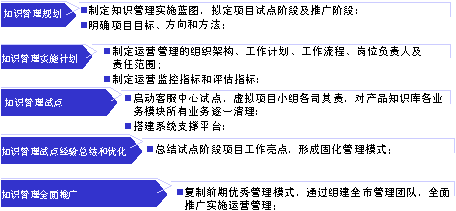 萬丈高樓平地起,本項目由客服中心總經理牽頭,副總經理和部門經理組成領導小組,全面審視中心運營管理現(xiàn)狀,探索“SECI知識循環(huán)管理”理論與實際工作結合點,針對客服中心滿意度提升的三大主要癥結勾勒出知識管理實施藍圖,試點階段和推廣階段,總體目標和階段性目標,監(jiān)控手段和評估指標等。