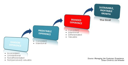 目前多數(shù)電信企業(yè)提供的都是‘隨機(jī)’體驗。隨機(jī)體驗是各種不連續(xù)端到端體驗的集合體。它發(fā)生在整體客戶體驗未得到恰當(dāng)管理或企業(yè)漠視客戶與員工的情況下。最終這將導(dǎo)致品牌走向墮落以及丟失有價值的客戶、利潤和企業(yè)價值。如果企業(yè)不想如上所述這樣慘淡收場,那么他們至少要做到創(chuàng)造和交付一種可預(yù)測的體驗——連續(xù)且有意向的(見圖1)。