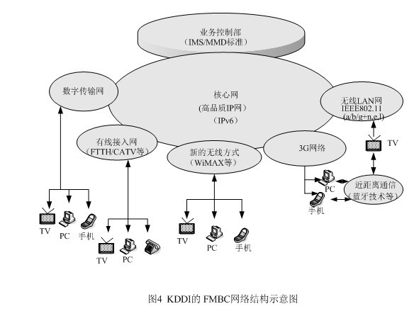 為了在市場競爭中立于不敗之地,KDDI另辟稀徑,提出了將固定網(wǎng)、移動網(wǎng)、因特網(wǎng)和電視廣播相融合的概念,它與朝日新聞、朝日電視簽署合作框架,就是它的集中代表。FMBC是超3G的構想,是以移動通信為基礎,與固定電話網(wǎng)及因特網(wǎng)進行融合,現(xiàn)在又把廣播電視納入,這樣它就成了KDDI的NGN了。FMBC的網(wǎng)絡結構請見圖4。從圖4上不難發(fā)現(xiàn)NGN的影子,特別是業(yè)務控制部的設立,并采用ISM/MMD標準,將網(wǎng)絡與應用分開,以利新業(yè)務的開拓,同時完成核心網(wǎng)的IP化,這些都是NGN的基本概念。
