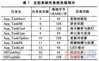 表1中除OSTaskStat和OSTaskIdle任務(wù)為系統(tǒng)自帶,其他7個(gè)任務(wù)均為用戶(hù)創(chuàng)建。App_TaskStart是系統(tǒng)的第一個(gè)任務(wù),對(duì)系統(tǒng)時(shí)鐘和底層設(shè)備進(jìn)行初始化,創(chuàng)建所有事件和其他各項(xiàng)用戶(hù)任務(wù),并對(duì)系統(tǒng)狀態(tài)進(jìn)行監(jiān)測(cè);App_TaskSR完成語(yǔ)音識(shí)別;App_TaskCmd完成對(duì)話(huà)集中命令的解析和執(zhí)行,并通過(guò)USART1向外發(fā)送;App_TaskCom作為外圍擴(kuò)展任務(wù),通過(guò)USART2向外發(fā)送指令或數(shù)據(jù),負(fù)責(zé)控制外圍擴(kuò)展設(shè)備,如語(yǔ)音合成設(shè)備等;