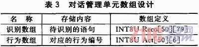 為了方便進(jìn)行對(duì)話(huà)的管理,本文中設(shè)計(jì)了一個(gè)對(duì)話(huà)管理單元,用于對(duì)等待識(shí)別的語(yǔ)句和等待執(zhí)行的命令進(jìn)行存儲(chǔ),在主控制器中通過(guò)定義二維數(shù)組來(lái)實(shí)現(xiàn)。LD3320每次識(shí)別最多可以設(shè)置50項(xiàng)候選識(shí)別句,每個(gè)識(shí)別句可以是單字、詞組或短句,長(zhǎng)度為不超過(guò)10個(gè)漢字或者79個(gè)字節(jié)的拼音串;谏鲜鲈,本文設(shè)計(jì)的對(duì)話(huà)管理數(shù)組如表3所列。