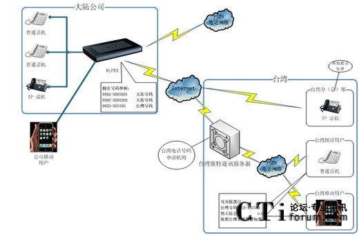 “兩岸通”利用最新的VOIP技術(shù),實(shí)現(xiàn)大陸固話辦公電話系統(tǒng)通過互聯(lián)網(wǎng)遠(yuǎn)程連接到臺(tái)灣的電話系統(tǒng),實(shí)現(xiàn)兩岸低資費(fèi)甚至零資費(fèi)電話互打。