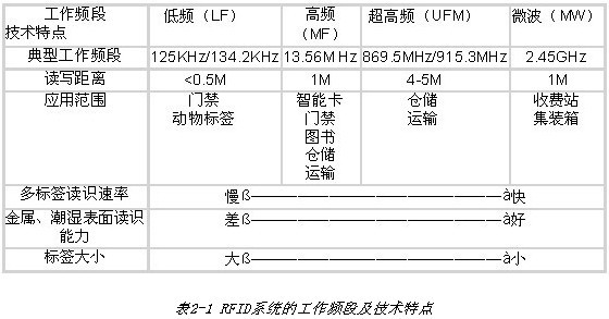 RFID系統(tǒng)的工作頻段可以為低頻(LF)(30-300kHz,典型頻率有125 kHz,134.2 kHz)、高頻(HF)(3-30MHz,典型頻率為13.56M Hz)、超高頻(UHF)(300-968MHz,典型頻率869.6MHz、915.3MHz)、微波(MW)(2.45-5.8GHz,典型頻率為2.45GHz)等四個(gè)頻段,具體的頻點(diǎn)由各個(gè)國家或地區(qū)的無線電管理部門確定。根據(jù)不同的工作頻段,在無源的情況下,其技術(shù)特點(diǎn)和應(yīng)用范圍也不同,如下表所示: