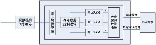 嵌入式攝像控制系統(tǒng)除了必要的電源電路以外,還要包括存儲電路、通信電路和下載電路等,所有的設備均與Avalon總線連接,這里主要介紹用戶邏輯接口Camera_show,它完成了模擬視頻數(shù)據(jù)轉化成數(shù)字視頻數(shù)據(jù)并在VGA上顯示的功能,主要包括模擬視頻信號的采集、分配(串并轉換電路完成)、存儲(存儲控制邏輯和片上RAM完成)和色度空間轉換。具體的功能框圖如圖1所示。
