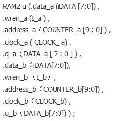 方法2 可以這樣實現(xiàn):在FPGA內(nèi)部使用Megacore,構造一個雙口的RAM,雙口RAM的輸入輸出信號的硬件描述語言定義如下: