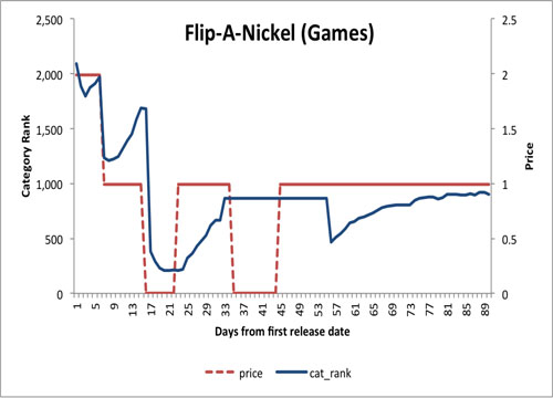 觀(guān)察那些熱門(mén)付費(fèi)應(yīng)用的運(yùn)營(yíng)策略,你會(huì)發(fā)現(xiàn)一個(gè)通行的做法——降價(jià)。降價(jià)的好處是使應(yīng)用的排名的快速上升。熱門(mén)付費(fèi)應(yīng)用在它們整個(gè)生命周期內(nèi)至少會(huì)降價(jià)一次。以上圖ASD公司開(kāi)發(fā)的娛樂(lè)應(yīng)用FlipANickel為例,應(yīng)用發(fā)布時(shí)的價(jià)格為1.99美元。七天后,應(yīng)用降價(jià)至0.99美元的同時(shí)排名從2200飆升至229。
