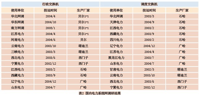 通過對(duì)目前國內(nèi)電力系統(tǒng)網(wǎng)省一級(jí)的用戶使用交換機(jī)設(shè)備品牌進(jìn)行電話調(diào)研統(tǒng)計(jì),從整體上更能體現(xiàn)交換設(shè)備技術(shù)發(fā)展走向,為軟交換應(yīng)用的可行性評(píng)估提供可靠的數(shù)據(jù)。表2為重點(diǎn)調(diào)研的匯總結(jié)果。