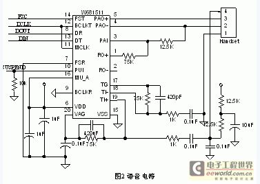 IP電話(huà)的原理圖如圖1所示。它由Tiger560B和W681511及其外圍設(shè)備和接口組成。主要電路有:語(yǔ)音電路、LCD顯示電路、鍵盤(pán)電路。