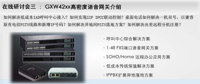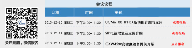 | 周二UCM專(zhuān)場(chǎng)報(bào)名 周三IP電話專(zhuān)場(chǎng)報(bào)名 周四網(wǎng)關(guān)專(zhuān)場(chǎng)報(bào)名 | ||||||