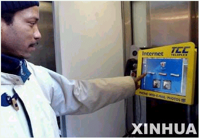 在美國(guó)紐約曼哈頓,一名男子正在使用網(wǎng)絡(luò)公用電話(huà)。美國(guó)第一部戶(hù)外網(wǎng)絡(luò)公用電話(huà)2月10日在紐約街頭開(kāi)始試用。