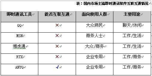 他認為,企業(yè)使用即使通訊的溝通是價值的溝通,企業(yè)內(nèi)外部的溝通過程中,不能互聯(lián)互通的溝通障礙將在很大程度上影響企業(yè)內(nèi)外部的信息交流甚至業(yè)務(wù)往來。他提醒筆者關(guān)注一款叫做ANYQ的系統(tǒng),他說,這是他研究以來發(fā)現(xiàn)最有潛力的一款已經(jīng)具備互聯(lián)互通配置的企業(yè)即時通訊軟件。