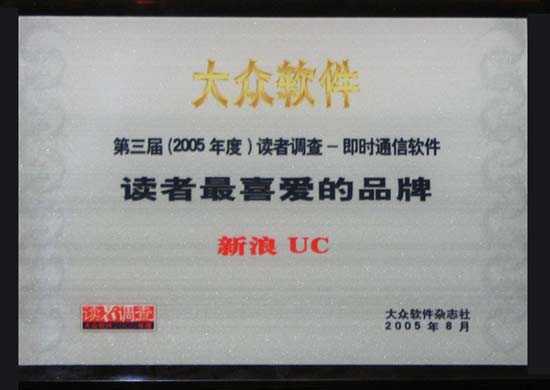 8月24日,在國(guó)內(nèi)知名IT媒體《大眾軟件》創(chuàng)刊10周年慶典上,《大眾軟件》隆重公布了“《大眾軟件》第三屆(2005年度)讀者調(diào)查報(bào)告”,新浪UC以12.20%的市場(chǎng)占有率,逼近排名第二的MSN(17.81%),實(shí)至名歸在國(guó)內(nèi)IM市場(chǎng)獲得第三的成績(jī),并獲得《大眾軟件》頒發(fā)的“第三屆(2005年度)讀者調(diào)查——即時(shí)通訊軟件”市場(chǎng)“讀者最喜愛的品牌”(圖一)。