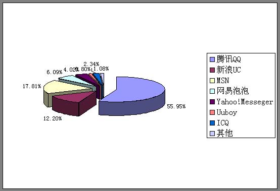 根據(jù)本次報(bào)告的“即時(shí)通信軟件使用情況分析”,新浪UC僅比排名第二的MSN相差5個(gè)百分點(diǎn),并以超過一倍的相當(dāng)優(yōu)勢(shì)超越排名第四、第五的其他IM軟件。至此,國(guó)內(nèi)IM領(lǐng)域已經(jīng)形成了以騰訊QQ、微軟MSN、新浪UC三大巨頭“瓜分天下”的格局,三者之和牢牢掌控了國(guó)內(nèi)IM領(lǐng)域?qū)⒔?6%以上的市場(chǎng)份額(圖二)。