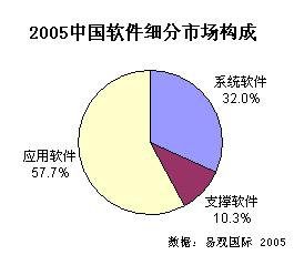 新華美通消息:易觀國際 發(fā)布的《IT 產品和服務-中國軟件市場年度綜合報告2005-2006》中數據顯示,2005年,中國軟件市場全年銷售額為324.4億元人民幣。同比增長22.2%。其中,系統(tǒng)軟件市場穩(wěn)定增長,市場規(guī)模達到103.8億元。支撐軟件市場增速提高,同比增長25.2%。應用軟件市場規(guī)模達187.3億人民幣,相比2004年的151.2億增長了23.9%。其中市場對應用軟件的需求量最大,占整個市場的57.7%。對系統(tǒng)軟件的需求居第二,占到32.0%,而支撐軟件則需求相對較小,占到10.3%的份額。