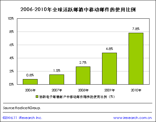 iResearch艾瑞市場咨詢根據(jù)市場咨詢公司RadicatiGroup公布的調(diào)查結(jié)果整理顯示,在2006年全球活躍電子郵箱賬號中有0.8%使用移動電子郵件服務(wù),移動電郵將會逐漸為高端用戶所接受,RadicatiGroup預(yù)計到2010年活躍電子郵箱賬號中使用移動電郵服務(wù)的比例將達到7.8%.