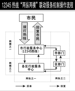 為了保證熱線順利開通提供優(yōu)質(zhì)服務(wù),有關(guān)方面還建立了“兩縱兩橫”聯(lián)動服務(wù)機制!皟煽v”即市行政服務(wù)中心與各區(qū)行政服務(wù)中心之間的縱向聯(lián)系,市級熱線成員單位與區(qū)級熱線成員單位之間的縱向聯(lián)系;“兩橫”即市行政服務(wù)中心與市級熱線成員單位的橫向聯(lián)系,各區(qū)行政服務(wù)中心與區(qū)級熱線成員單位之間的橫向聯(lián)系。