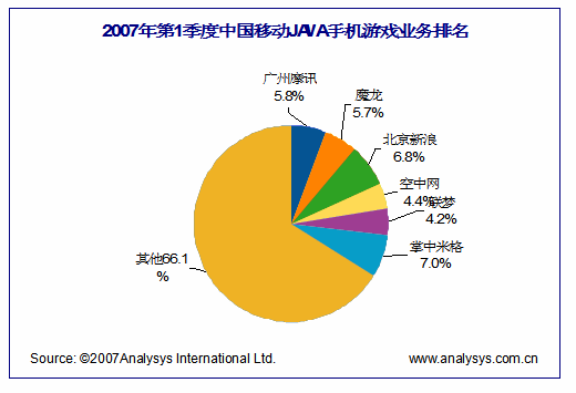 從企業(yè)實力和市場份額來看,目前手機游戲市場主要有三股力量組成,以空中等為代表的全業(yè)務(wù)線電信增值服務(wù)商(SP),以新浪等為代表的互聯(lián)網(wǎng)門戶綜合服務(wù)商,以米格、魔龍為代表的專業(yè)手機游戲產(chǎn)品與服務(wù)提供商(SP)。根據(jù)中國移動“百寶箱”第1季度收入數(shù)據(jù),易觀注意到,掌中米格、北京新浪、廣州摩訊位列前三,前三名占據(jù)了近20%的市場份額。夢網(wǎng)手機游戲精品業(yè)務(wù)的三家服務(wù)提供商第一季度收入排名為:米格、新浪、空中網(wǎng)!