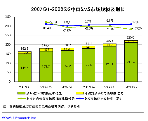 08Q3中國短信市場規(guī)模將繼續(xù)保持增長,非點對點業(yè)務下滑放緩