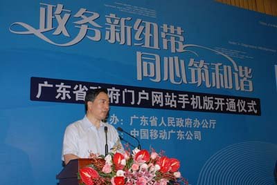 2009年8月7日,廣東省政府在廣州舉行省政府門戶網(wǎng)站手機(jī)版開通儀式。省政府秘書長徐尚武、中國移動廣東公司總經(jīng)理徐龍?jiān)陂_通儀式上致辭。