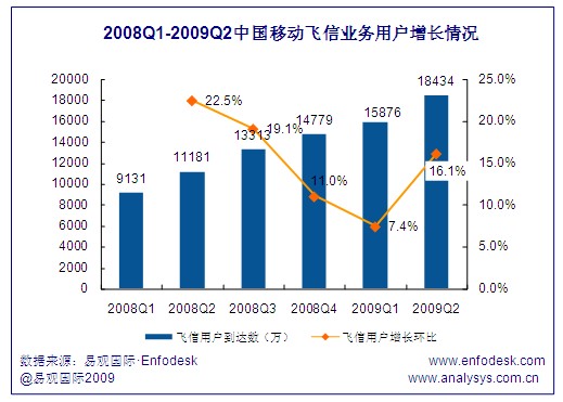 截至2009年第2季度,中國(guó)移動(dòng)飛信用戶到達(dá)數(shù)達(dá)1.84億,環(huán)比增長(zhǎng)16.1%,與2008年第2季度的1.12億用戶到達(dá)數(shù)相比同比增長(zhǎng)64.9%,可見飛信用戶規(guī)模增長(zhǎng)的速度十分迅速,究其原因一方面在于飛信運(yùn)營(yíng)商不遺余力的多渠道營(yíng)銷宣傳,另一方面在于飛信用戶的口碑傳播,由于用戶規(guī)模的增長(zhǎng)帶來(lái)更多用戶嘗試體驗(yàn)飛信業(yè)務(wù)。