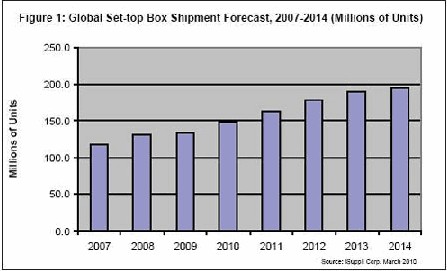 據iSuppli公司,機頂盒出貨量未來幾年將繼續(xù)增長。消費者收看模式發(fā)生轉變,通過互聯(lián)網提供的電視內容越來越流行,從而將為提供商創(chuàng)造條件,在數字家庭的激烈爭奪中獲得新的營業(yè)收入來源。