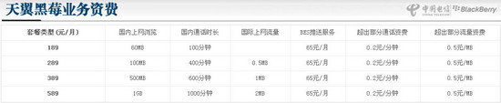 目前電信推出的黑莓手機(jī)套餐分為四類(lèi),一類(lèi)為天翼黑莓簡(jiǎn)裝版,價(jià)格為每月189元,包括60MB國(guó)內(nèi)上網(wǎng)流量,100分鐘國(guó)內(nèi)語(yǔ)音通話時(shí)長(zhǎng);第二類(lèi)是天翼黑莓標(biāo)準(zhǔn)版套餐,價(jià)格為289元,包括100MB國(guó)內(nèi)上網(wǎng)流量,0.5MB國(guó)際上網(wǎng)流量,400分鐘國(guó)內(nèi)語(yǔ)音通話時(shí)長(zhǎng);第三類(lèi)和第四類(lèi)為天翼尊享版套餐包括389元和589元兩種資費(fèi),前者包括500MB國(guó)內(nèi)上網(wǎng)流量,1MB國(guó)際上網(wǎng)流量,600分鐘國(guó)內(nèi)語(yǔ)音通話時(shí)長(zhǎng);后者包括1GB國(guó)內(nèi)上網(wǎng)流量,2MB國(guó)際上網(wǎng)流量,1000分鐘國(guó)內(nèi)語(yǔ)音通話時(shí)長(zhǎng)。