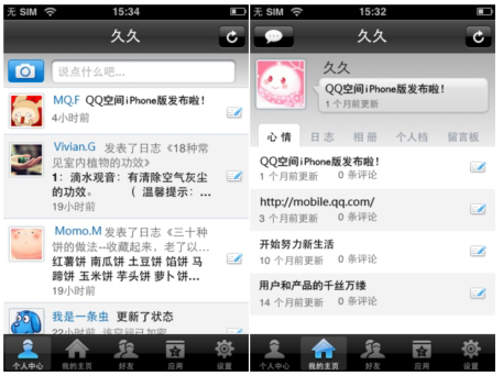 QQ空間foriPhone的外觀界面完全繼承了iPhone上應(yīng)用軟件的清新簡(jiǎn)潔風(fēng)格,軟件主界面包括個(gè)人中心、我的主頁、好友、應(yīng)用、設(shè)置五大功能。點(diǎn)擊個(gè)人中心可以看到自己的狀態(tài)、簽名以及好友的最新動(dòng)態(tài)。并且可以直接使用置頂?shù)呐恼真I拍照,即時(shí)拍照上傳至空間,使用置頂?shù)男那檩斎肟蛴涗涀约旱男那椤?br />